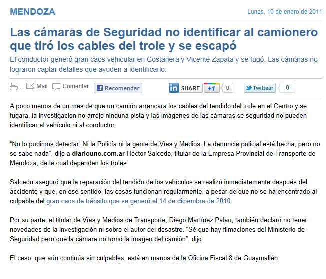 Este articulo en su primera parte comenta que las cámaras no pudieron identificar a el camión y tampoco a sus conductores, reflejo del uso de cámaras de baja calidad y resolución. Sobre el final se indica que las cámara no tomaron a el camión, esto puede ocurrir con los DOMO PTZ que no poseen soporte panorámico y solo enfocan una escasa escena de todo el contexto no grabando lo requerido en el análisis posterior.