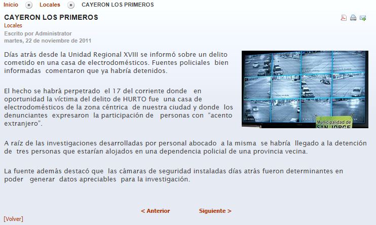 Este artículo indica en su parte final que el sistema de cámara fue determinante por generar datos apreciables para el esclarecimiento. San Jorge posee un Sistema VIGINETIP de alta definición vinculado por Fibra Óptica, Puntos Cámaras de 10 Megapixel entregan imágenes altamente identificables con un elevado poder probatorio.